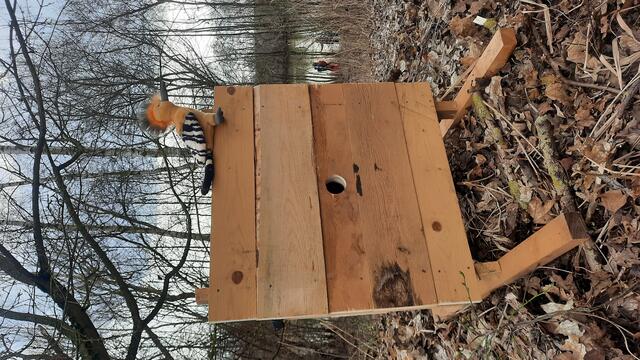 V sobotu 14. března vytvořil Kryštof s Fandou a s pomocí Fíly a Honzy C. velkou speciální budku pro dudka chocholatého. Tenhle u nás zatím spíš vzácný pták se ozýval svým nezaměnitelným dudáním vloni celé jaro od rybníku Podlesák, takže je šance, že by tu mohl letos i zahnízdit.