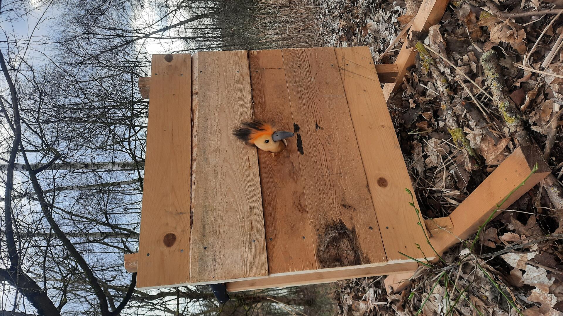 Hotovou budku jsme odnesli spolu s účastníky dílničky na výrobu ptačích budek k Podlesáku a usadili ji na klidné místo, kde dudky nebude nikdo rušit. Snad se jim tu bude líbit!